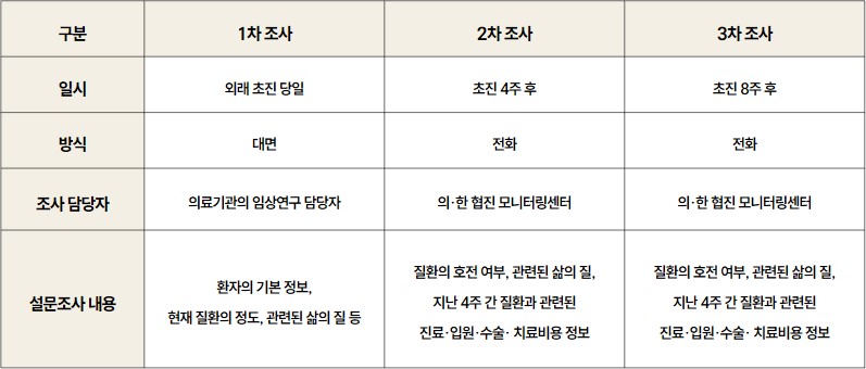 - 2차 조사(내원 4주 후), 3차 조사(내원 8주 후)는 의·한 협진 모니터링센터가 전화를 통해 질환의 호전 여부, 관련된 삶의 질, 지난 4주 간 질환과 관련된 진료·입원·수술· 치료비용 정보를 수집합니다. 이 때 의·한 협진 모니터링센터의 조사 담당자는 환자분이 협진을 받으셨는지 여부를 알 수 없습니다.