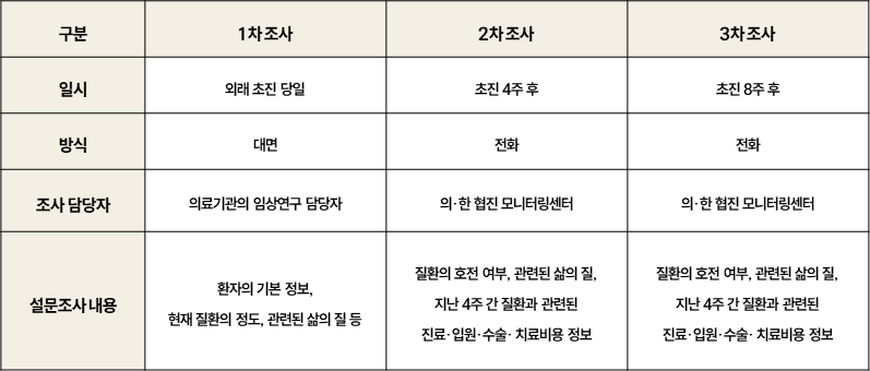 - 2차 조사(내원 4주 후), 3차 조사(내원 8주 후)는 의·한 협진 모니터링센터가 전화를 통해 질환의 호전 여부, 관련된 삶의 질, 지난 4주 간 질환과 관련된 진료·입원·수술· 치료비용 정보를 수집합니다. 이 때 의·한 협진 모니터링센터의 조사 담당자는 환자분이 협진을 받으셨는지 여부를 알 수 없습니다.