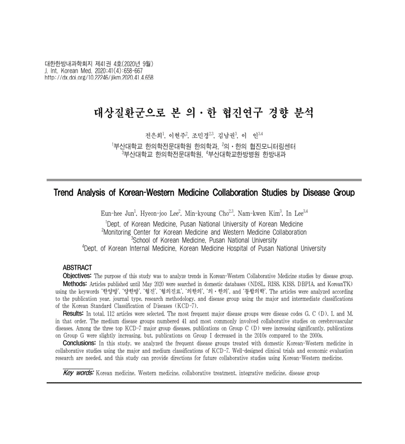 Eun-heeJun, Hyeon-jooLee, Min-kyoungCho, Nam-kwenKim, InLee. Trend Analysis of Korean-Western Medicine Collaboration Studies by Disease Group. J.Int.KoreanMed.2020;41(4):658-667 Link