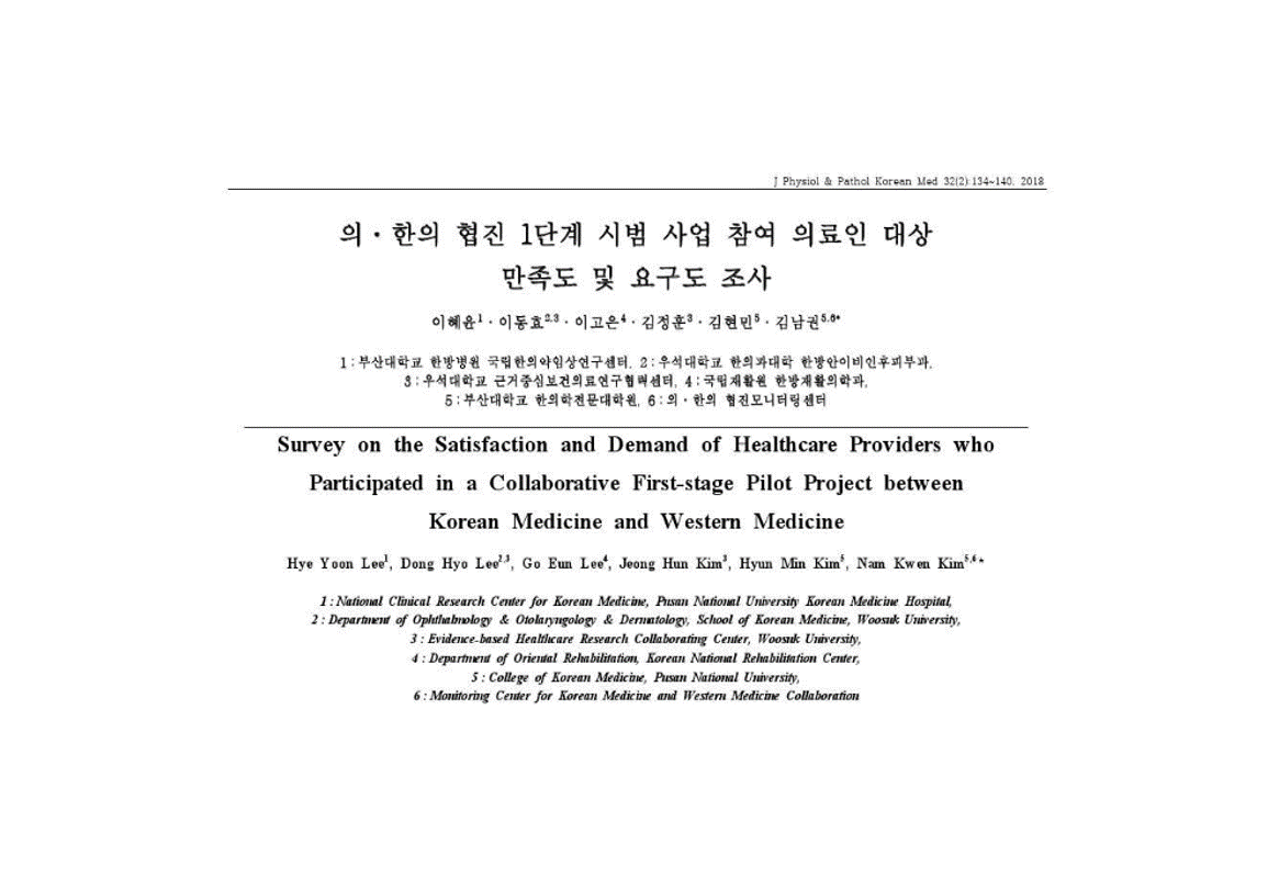 Hye Yoon Lee, Dong Hyo Lee, Go Eun Lee, Jeong Hun Kim, Hyun Min Kim, Nam Kwen Kim. Survey on the Satisfaction and Demand of Healthcare Providers who Participated in a Collaborative First-stage Pilot Project between Korean Medicine and Western Medicine. J Physiol & Pathol Korean Med. 2018;32(2):134-140. Link