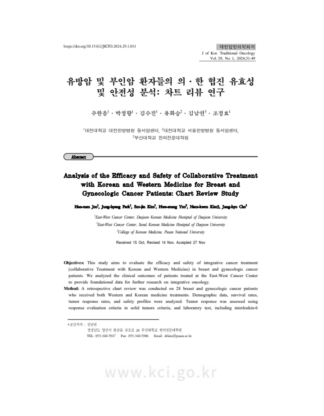 Han-eum Joo, Jung-hyang Park, Soo-jin Kim, Hwa-Seung Yoo, Nam-kwen Kim, Jung-hyo Cho. Analysis of the Efficacy and Safety of Collaborative Treatment with Korean and Western Medicine for Breast and Gynecologic Cancer Patients: Chart Review Study.2024;29(1):31-49. Link