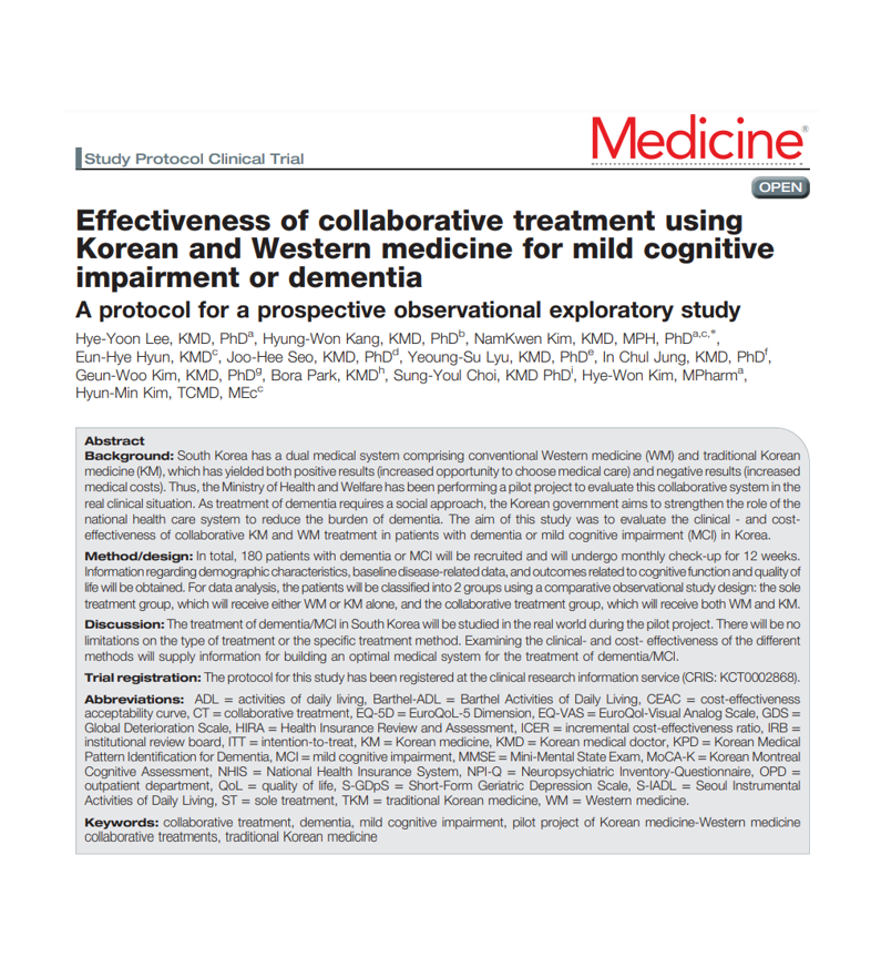 Lee H-Y, Kang H-W, Kim N, Hyun E-H, Seo J-H, Lyu Y-S, et al. Effectiveness of collaborative treatment using Korean and Western medicine for mild cognitive impairment or dementia: A protocol for a prospective observational exploratory study. Medicine. 2018;97(35):e12098. Link