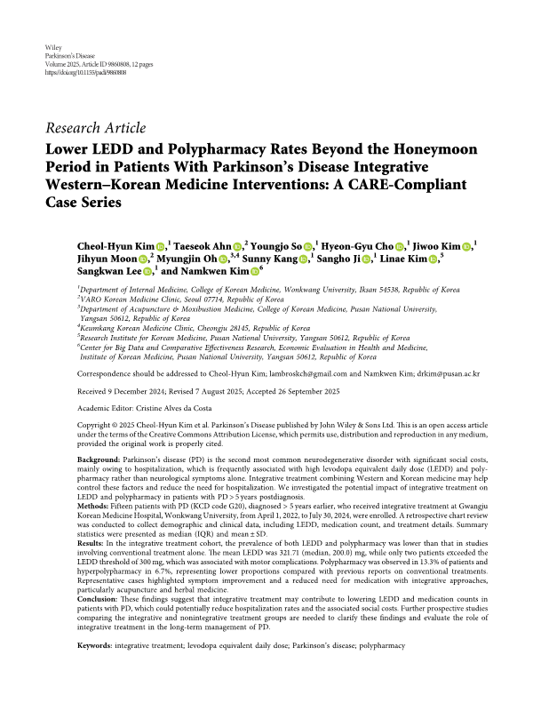 Kim CH, Ahn T, So Y, Cho HG, Kim J, Moon J, et al. Lower LEDD and Polypharmacy Rates Beyond the Honeymoon Period in Patients With Parkinsons Disease Integrative Western-Korean Medicine Interventions: A CARE-Compliant Case Series. Parkinsons Dis. 2025;2025:9860808. Link
