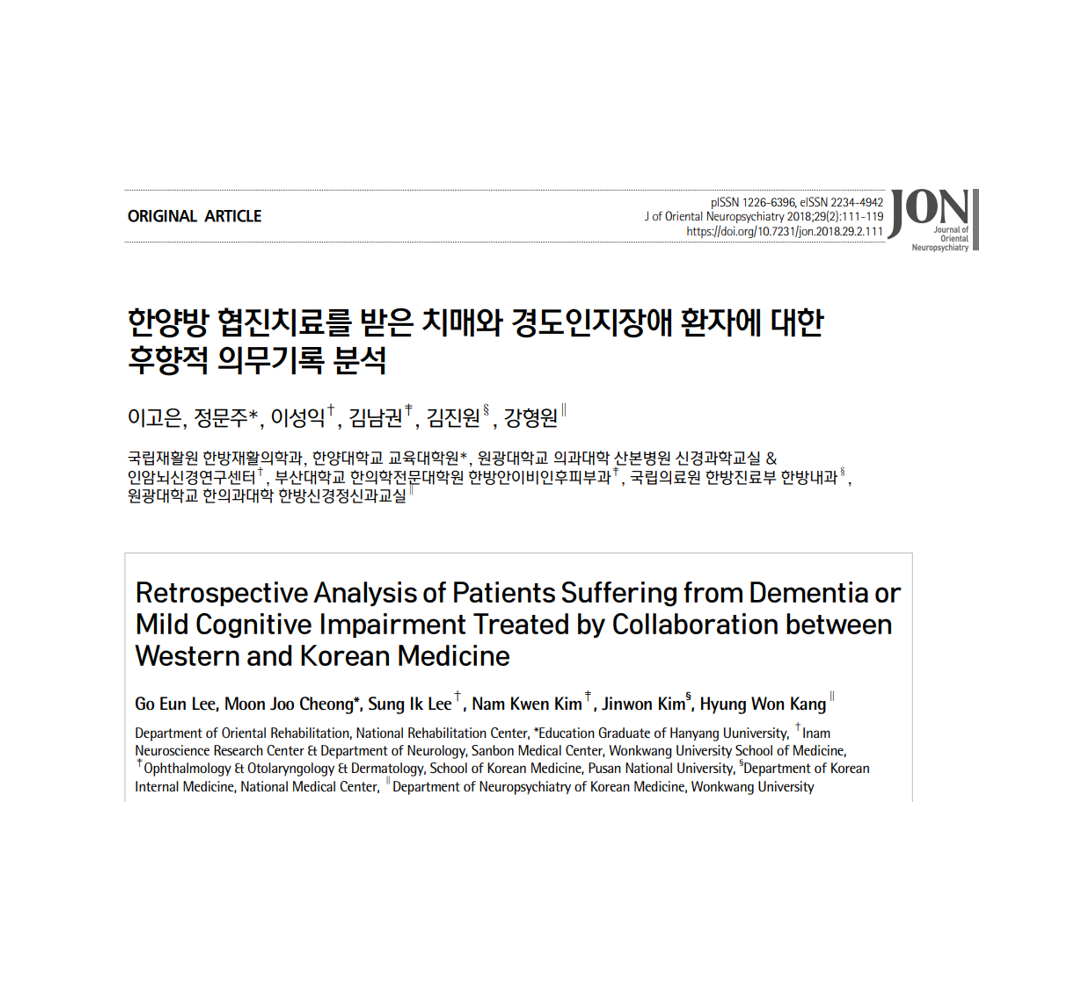 Go Eun Lee, Cheong Moon Joo, Sung Ik Lee, Kim Namkwen, Jinwon Kim, Hyung-Won Kang. Retrospective Analysis of Patients Suffering from Dementia or Mild Cognitive Impairment Treated by Collaboration between Western. and Korean Medicine. J of Oriental Neuropsychiatry 2018;29(2):111-119 Link