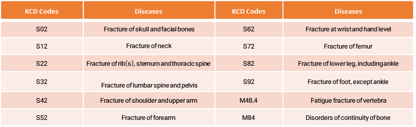 - Patients diagnosed with a primary condition related to fractures, based on the KCD codes listed below.