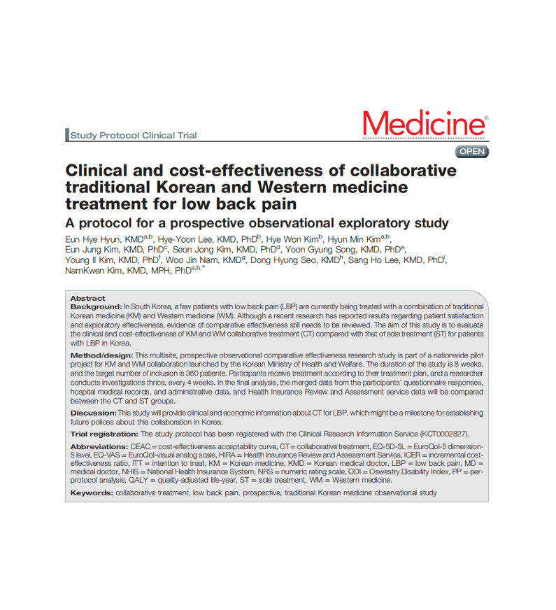 Lee H-Y, Kang H-W, Kim N, Hyun E-H, Seo J-H, Lyu Y-S, et al. Effectiveness of collaborative treatment using Korean and Western medicine for mild cognitive impairment or dementia: A protocol for a prospective observational exploratory study. Medicine. 2018;97(35):e12098.