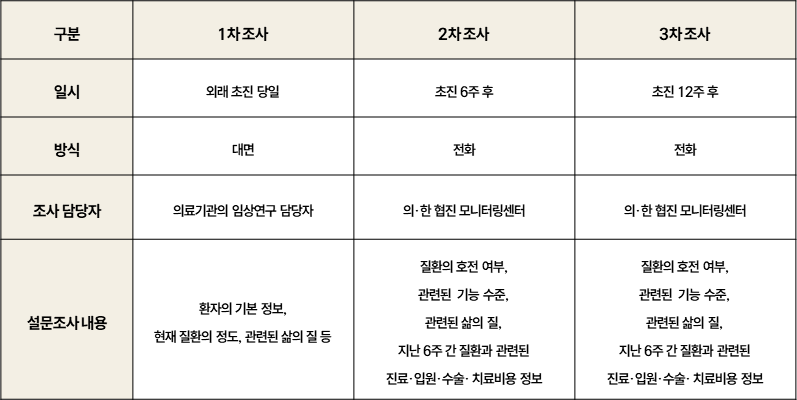 · 첫 조사는 진료를 받은 의료기관의 담당자가 환자의 기본 정보, 현재 질환의 정도, 관련된 삶의 질 등의 정보를 수집합니다.