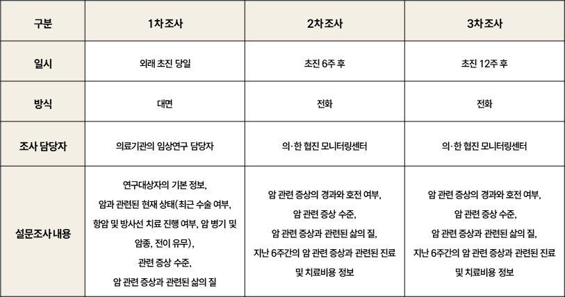 · 2차 조사(내원 6주 후), 3차 조사(내원 12주 후)는 의·한 협진 모니터링센터가 전화를 통해 암 관련 증상의 경과와 호전 여부, 암 관련 증상 수준, 암 관련 증상과 관련된 삶의 질, 지난 6주간의 암 관련 증상과 관련된 진료 및 치료비용 정보를 수집합니다.