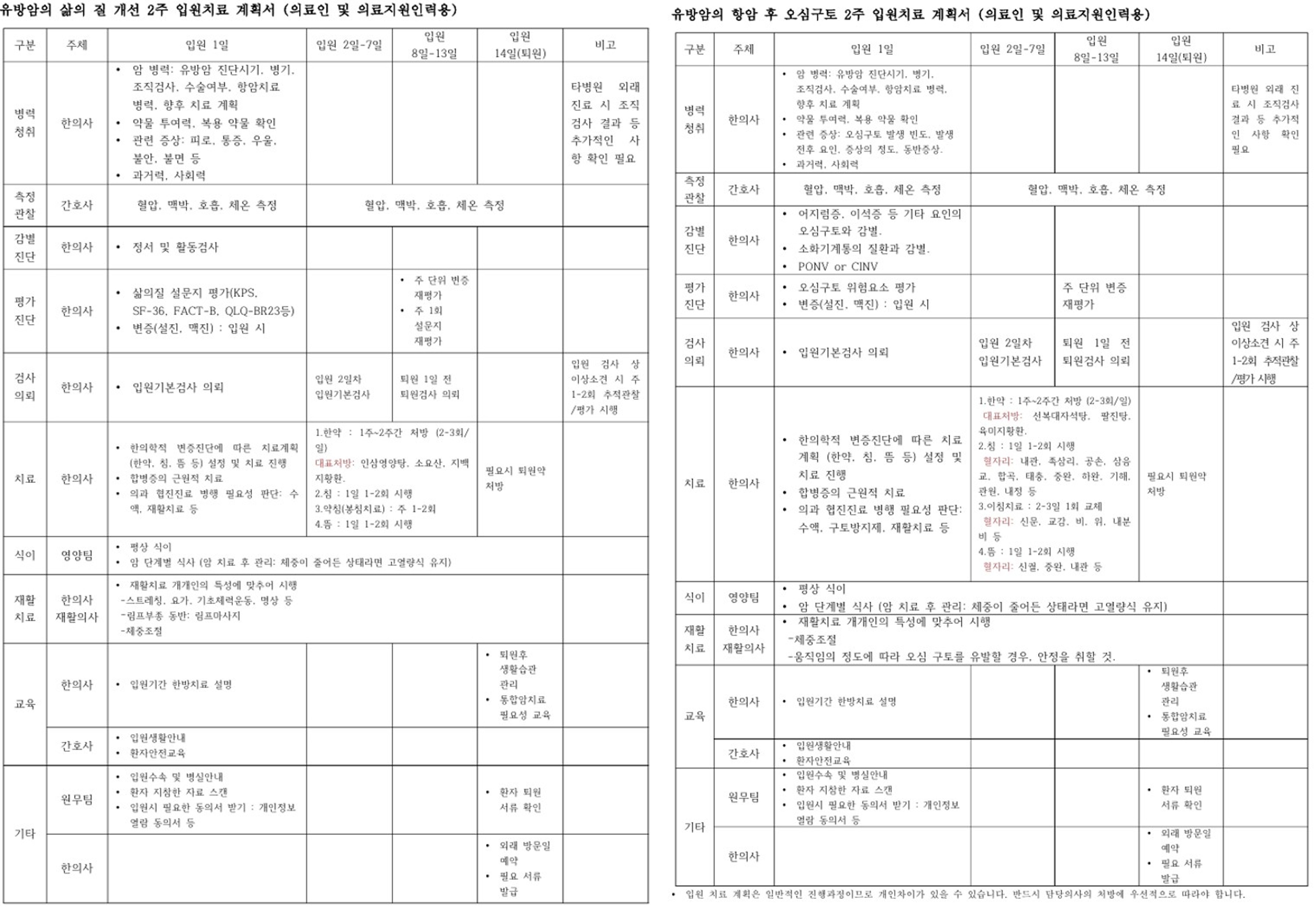유방암 (유방암 관련 증상) 협진병원용 한의표준임상경로
