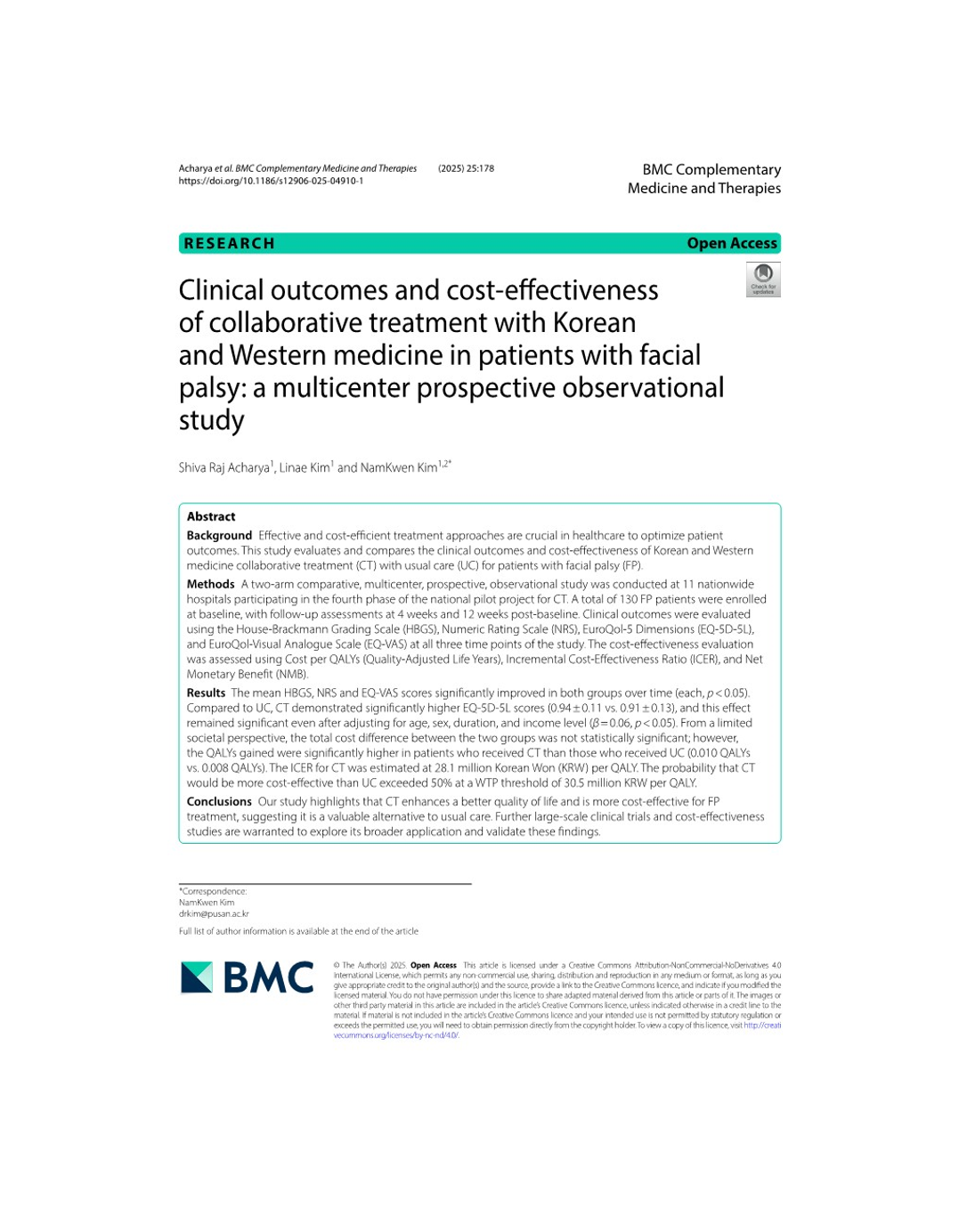 Shiva Raj Acharya, Linae Kim, and NamKwen Kim. Clinical outcomes and cost-effectiveness of collaborative treatment with Korean and Western medicine in patients with facial palsy: a multicenter prospective observational study. BMC Complement Med Ther. 2025 May 15;25(1):178. Link