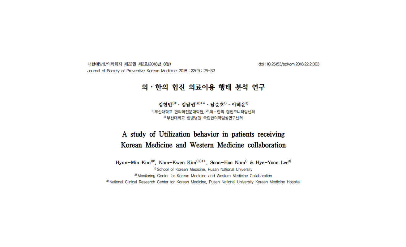 Hyun-Min Kim, Nam-Kwen Kim, Soon-Hoo Nam, Hye-Yoon Lee. A study of Utilization behavior in patients receiving Korean Medicine and Western Medicine collaboration. Journal of Society of Preventive Korean Medicine 2018;22(2):25-32 Link