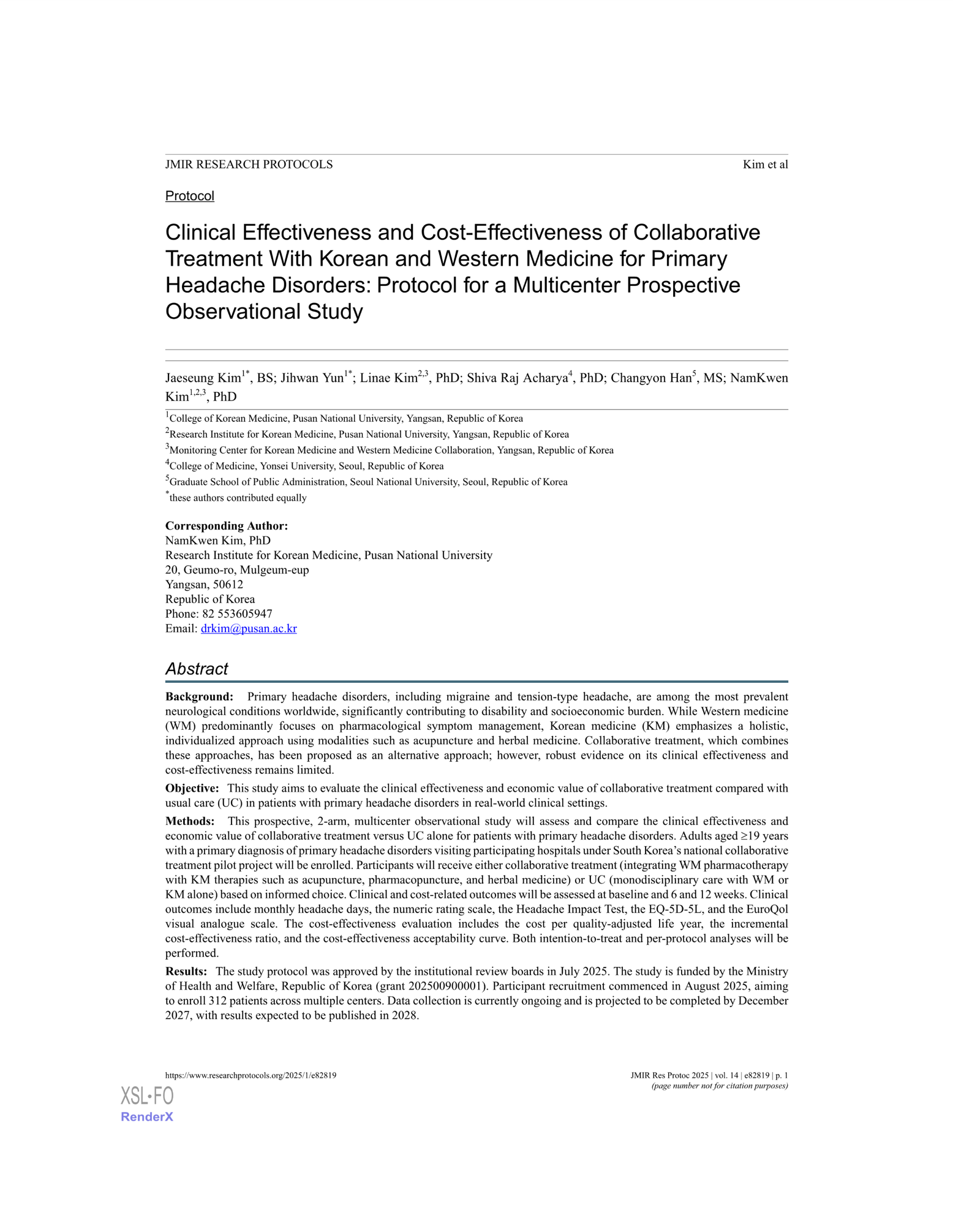 Jaeseung Kim, Jihwan Yun, Linae Kim, Shiva Raj Acharya, Changyon Han, NamKwen Kim. Clinical effectiveness and cost-effectiveness of collaborative treatment with Korean and Western medicine for primary headache disorders: protocol for a multicenter prospective observational study. JMIR Res Protoc. 2025;14:e82819. Link