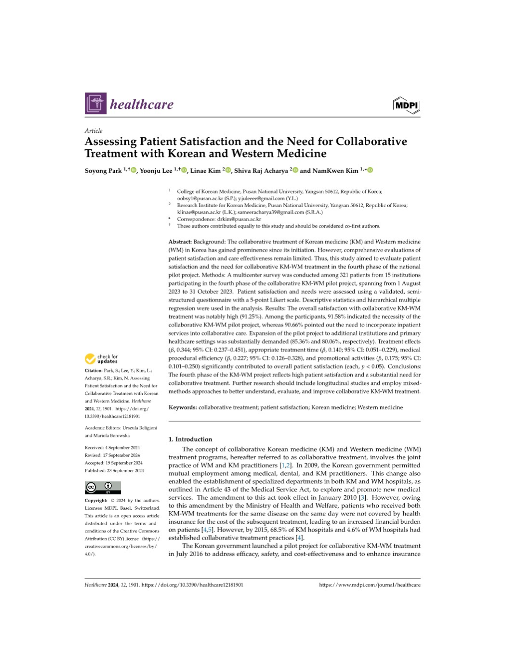 Soyong Park, Yoonju Lee, Linae Kim, Shiva Raj Acharya, NamKwen Kim. Assessing Patient Satisfaction and the Need for Collaborative Treatment with Korean and Western Medicine. 2024;12(18):1901. Link