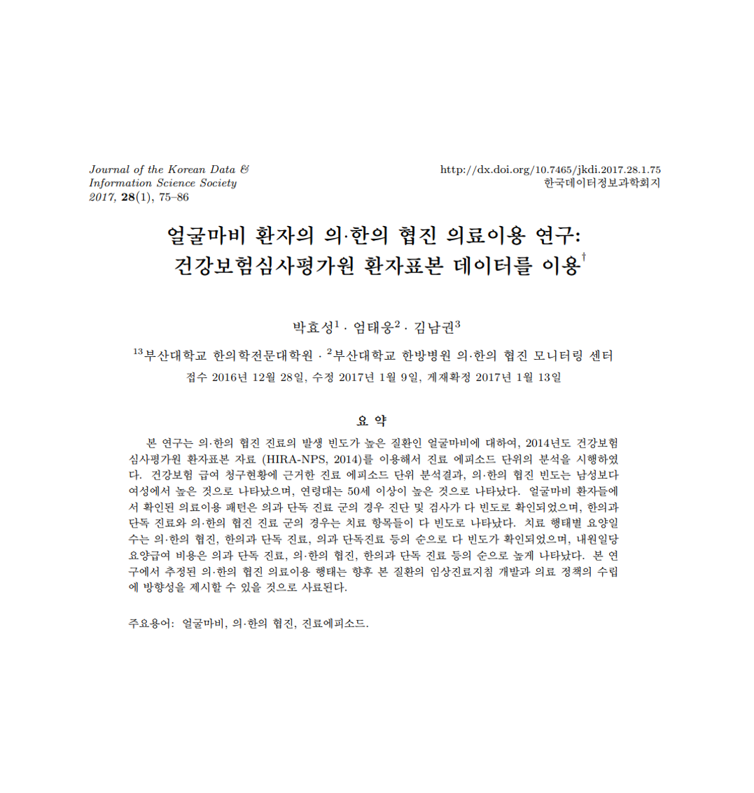 Hyo Sung Park, Tae-Woong Uhm, Kim Namkwen. A study on the facial palsy patients’ use of Western-Korean collaborative treatment: Using Health Insurance Review & Assessment Service-National Patients Sample. Journal of the Korean Data & Information Science Society. 2017, 28(1), 75–86 Link