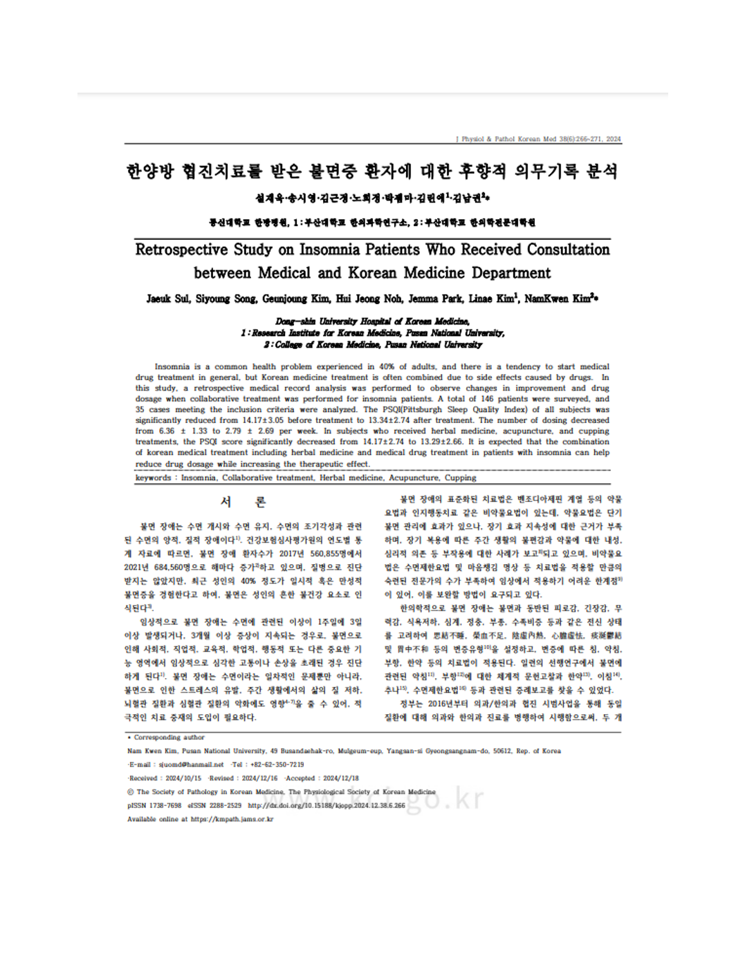 Jaeuk Sul, Siyoung Song, Geunjoung Kim, Hui Jeong Noh, Jemma Park, Linae Kim, NamKwen Kim. Retrospective Study on Insomnia Patients Who Received Consultation between Medical and Korean Medicine Department. J Physiol & Pathol Korean Med. 2024;38(6):266-271. Link
