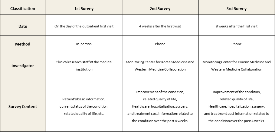 - The second survey (4 weeks after the initial visit) and the third survey (8 weeks after the initial visit) will be conducted by the Korean Medicine and Western Medicine Collaboration Monitoring Center via phone. These surveys will gather data on the progress of the condition, changes in quality of life, and medical costs (e.g., visits, hospitalizations, surgeries, and treatments) incurred over the past four weeks.